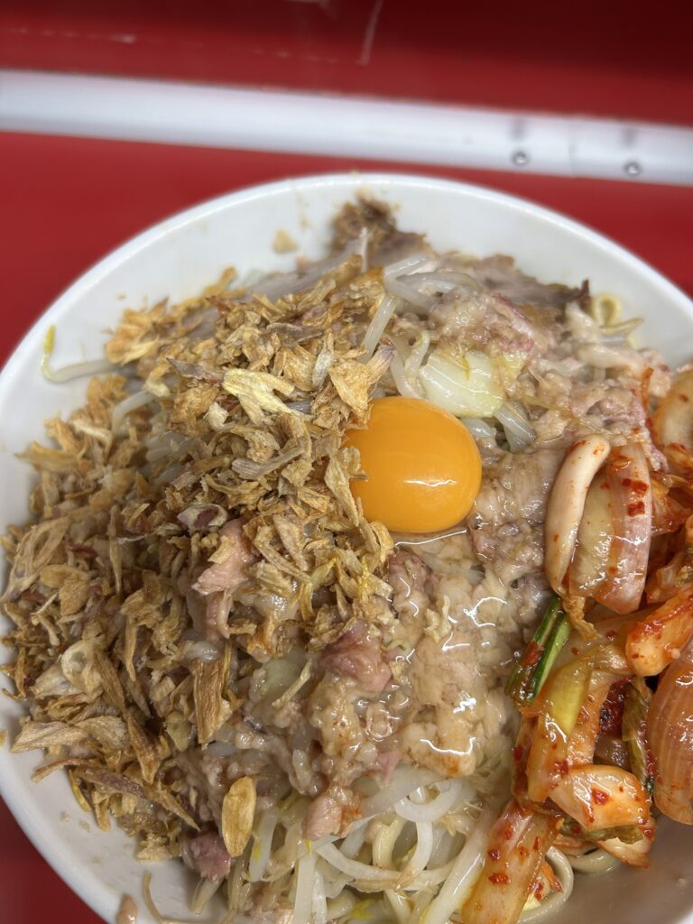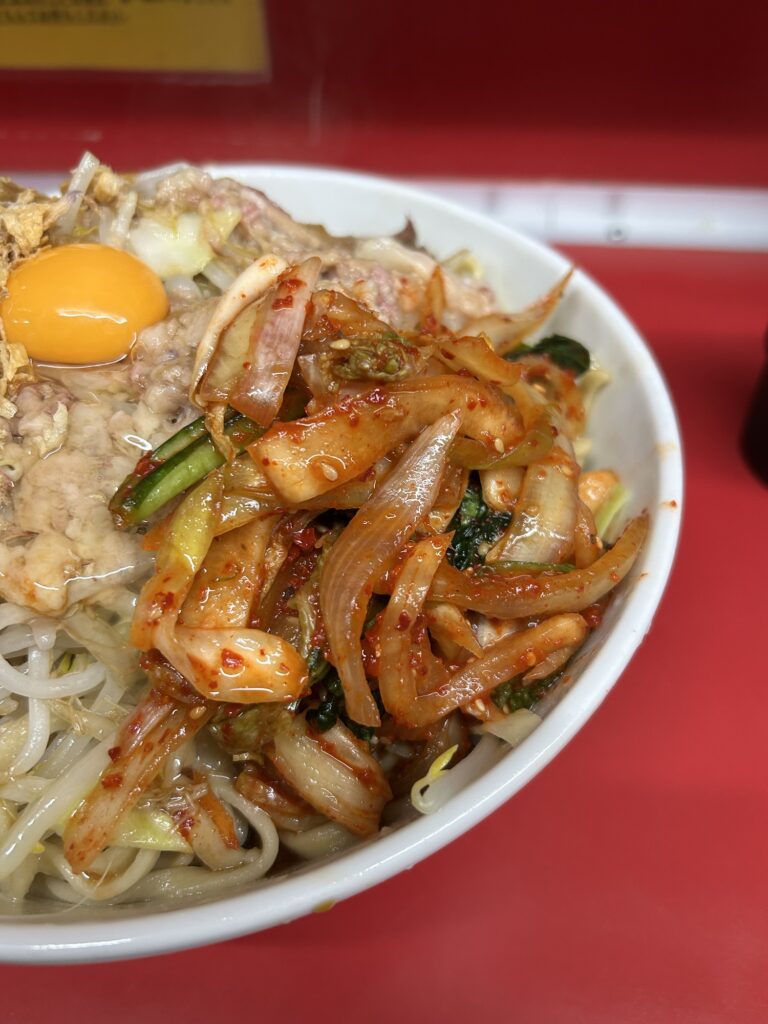てっぺんに🥚、その他にフライドオニオン、そして大量のキムチ